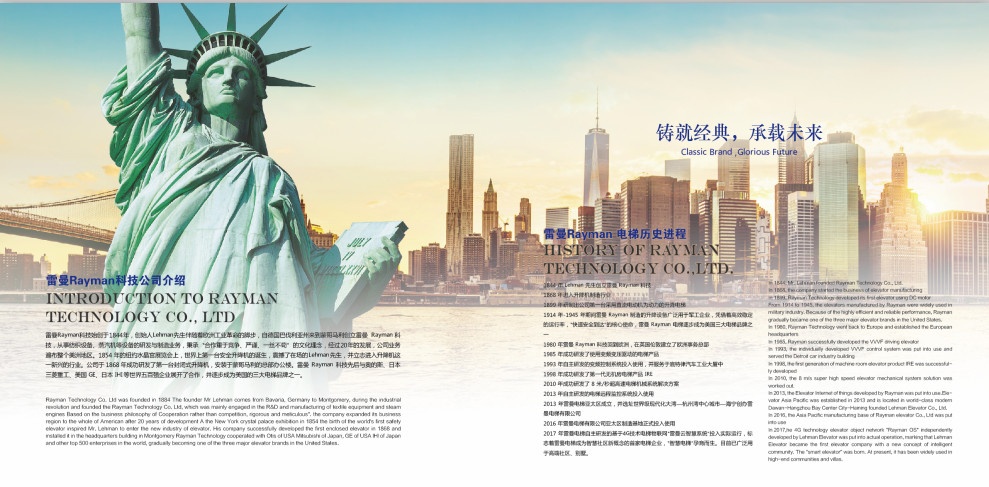 雷曼Rayman電梯有限公司是美國雷曼科技集團旗下全資子公司,品牌名稱為“Rayman雷曼電梯”,定位高端,1868年雷曼品牌的誕生,一個跨世紀的經(jīng)典品牌傳承至今已逾一百五十余載,目前已為全球60余個國家和地區(qū)提供最優(yōu)秀的樓宇交通解決方案,不斷贏得市場的認可與合作伙伴的信任,雷曼電梯始終如一,堅持做好產(chǎn)品,不忘初心。